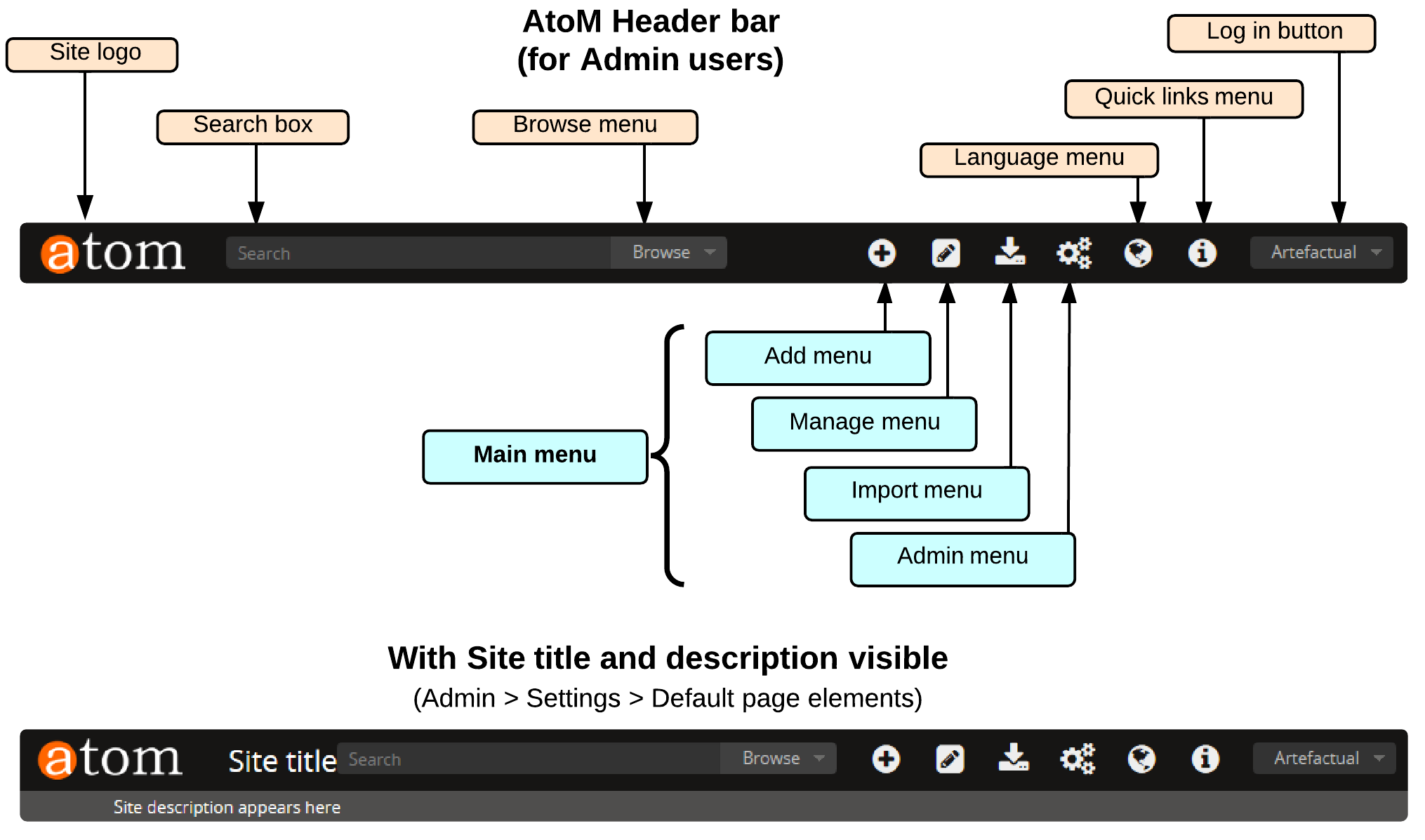 This section outlines user interface elements that appear throughout the AtoM application on different page types. Understanding how these reoccurring page elements are used in the application will improve a user’s ability to navigate the application effectively. Recurring page elements listed below include: