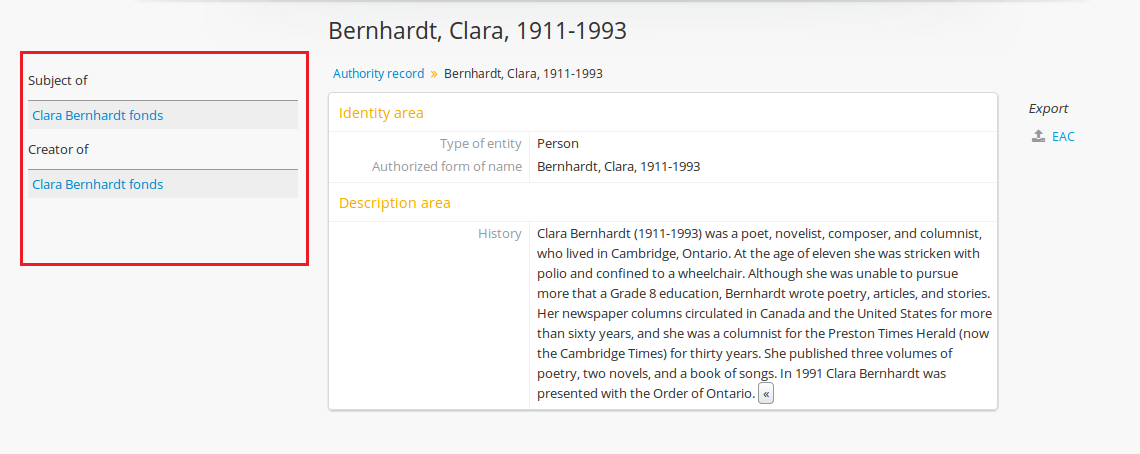 - Related people and organizations, including the creator of the resource described as well as an people or organizations who are the subject of the resource described. These link to the authority record for the person or organization.