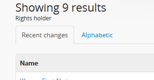 On search and/or browse pages for rights holders and functions, the same sort options are presented as tabs the user can click to change the view - clicking the inactive tab will reload the page in the new sort order (alphabetic, most recent, or identifier).