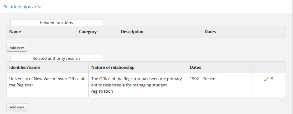 - The related authority record will now appear in the Related authority records table of the Relationships area. Click the pencil icon to re-open the pop-up dialog and edit the relationship, or click the X icon to remove the relationship link. You can also repeat this process to add multiple links by clicking the “Add new” button below the Related authority records again - AtoM will open a new pop-up dialog. Repeat steps 3-6 as needed.