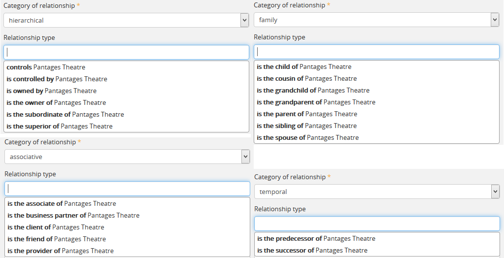 - The “Type of relationship” field is pre-populated with default terms, pictured in the image below. These terms can be edited and managed in the Actor Relation Type taxonomy, and new terms can be added as well. For more information on managing terms, see: Terms; see specifically Add/edit a converse term.