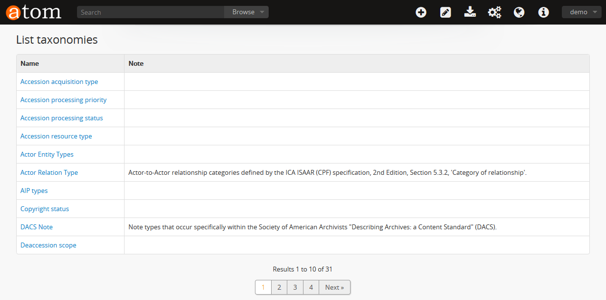 AtoM ships with a fixed number of taxonomies containing default values (terms). Some terms are locked, i.e. cannot be edited or deleted, because they are used by the application’s underlying code. Most terms, however, can be edited or deleted, and all taxonomies can be assigned new terms in addition to any locked values.