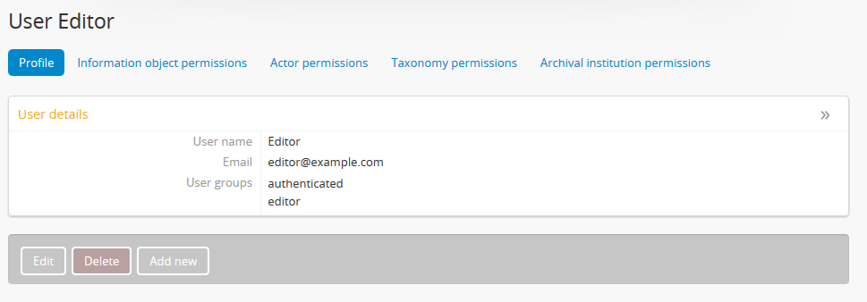 Once the new user has been saved, AtoM will direct you to the :group’s view page, where you can review your work. Clicking “Edit” in the button block at the bottom of the user profile will re-open the user in edit mode.