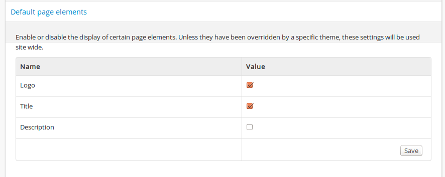 2. Click on or scroll down to Default page elements. Check or uncheck the boxes beside the elements you would like to add or remove and click Save.