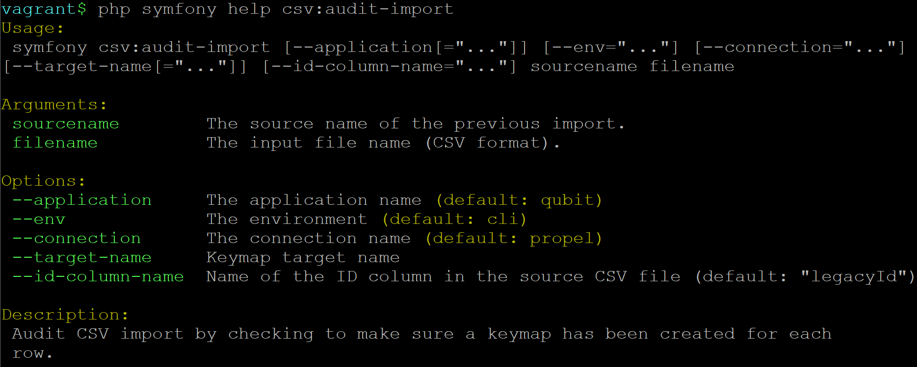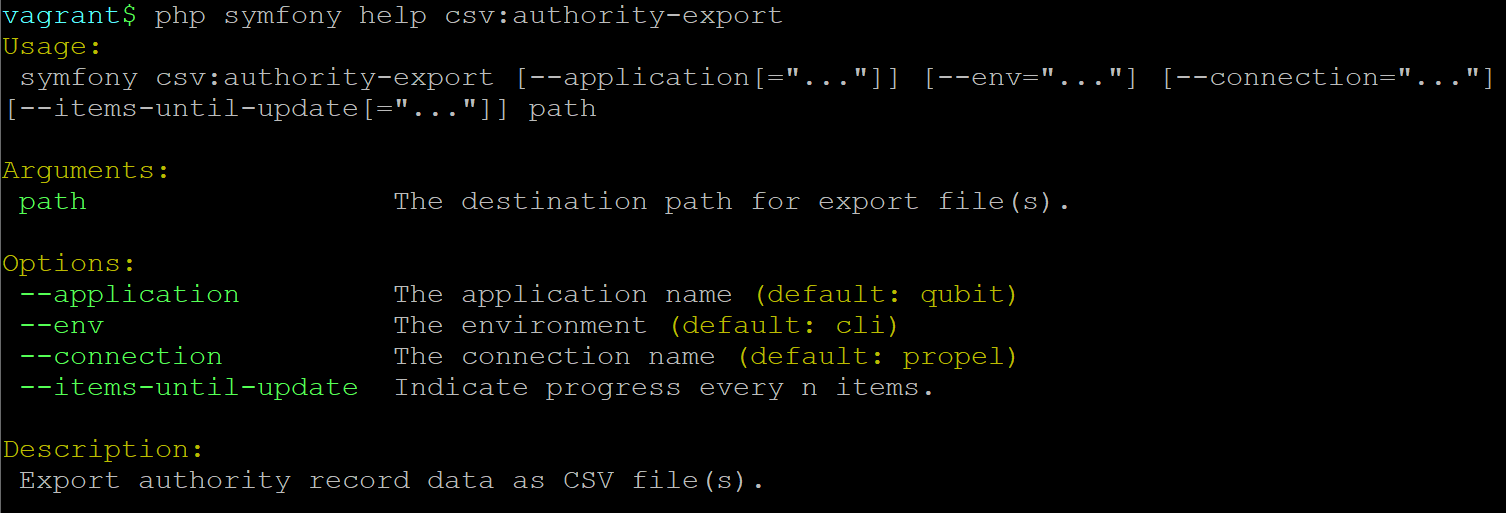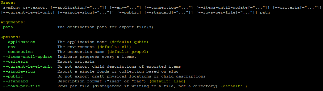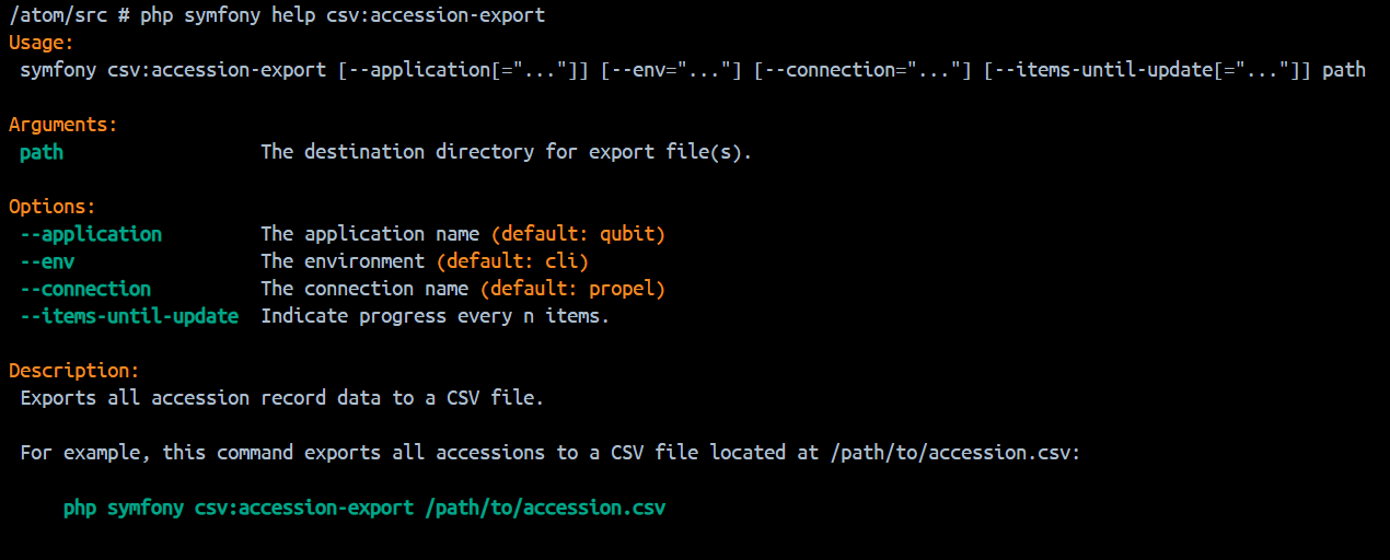 Entering php symfony help csv:accession-export into the command-line from