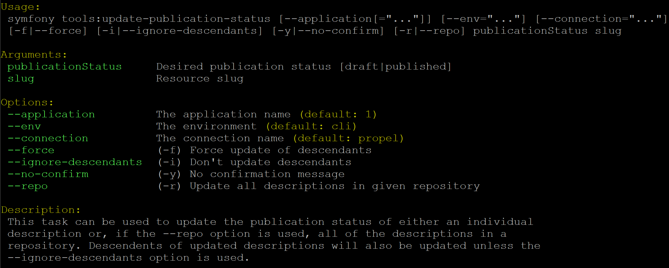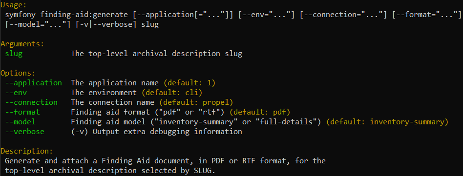 This task will output the full search index of a particular archival description, which can be useful for determining index mappings, or troubleshooting why a search is not returning the expected results. The task takes the slug of a target description as input. Basic syntax: