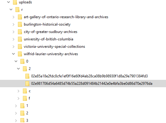 Lower subdirectories after this are used to house digital objects. For each uploaded or linked object, AtoM will add a SHA-256 hash of the object and then, to avoid collisions and aid in retrieval, it will create a specific set of subdirectories based on this hash - 3 subdirectories named after the first 3 characters in the hash, followed by a final nested subdirectory named after the remaining hash characters.
