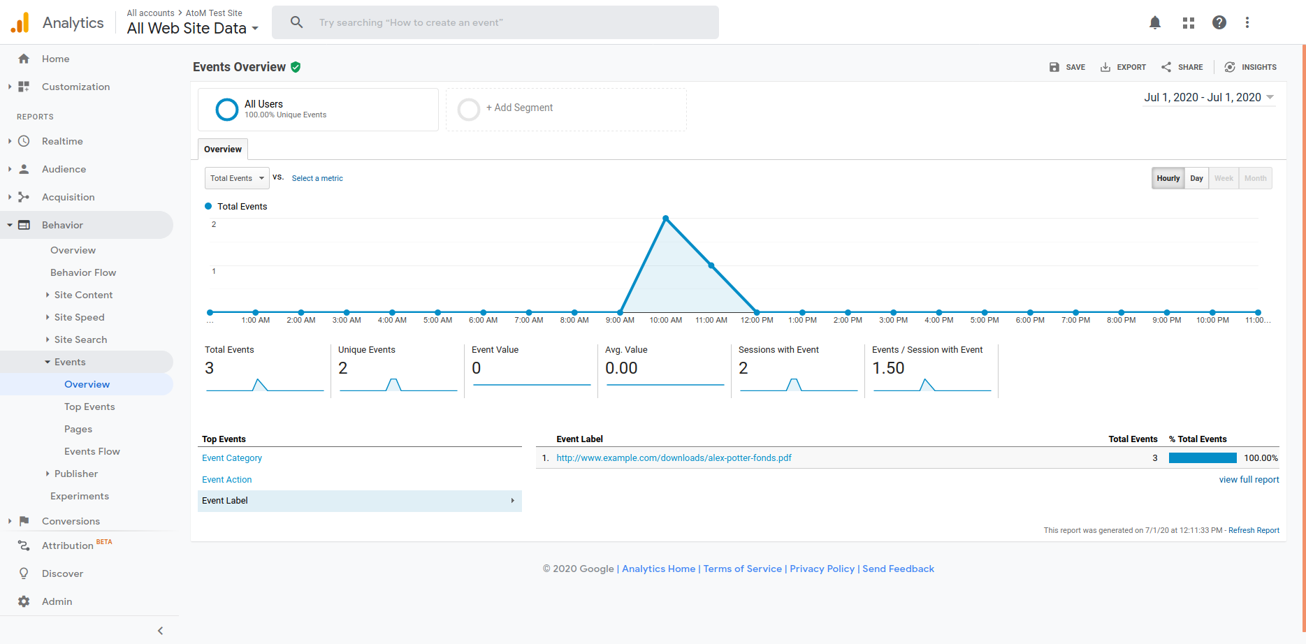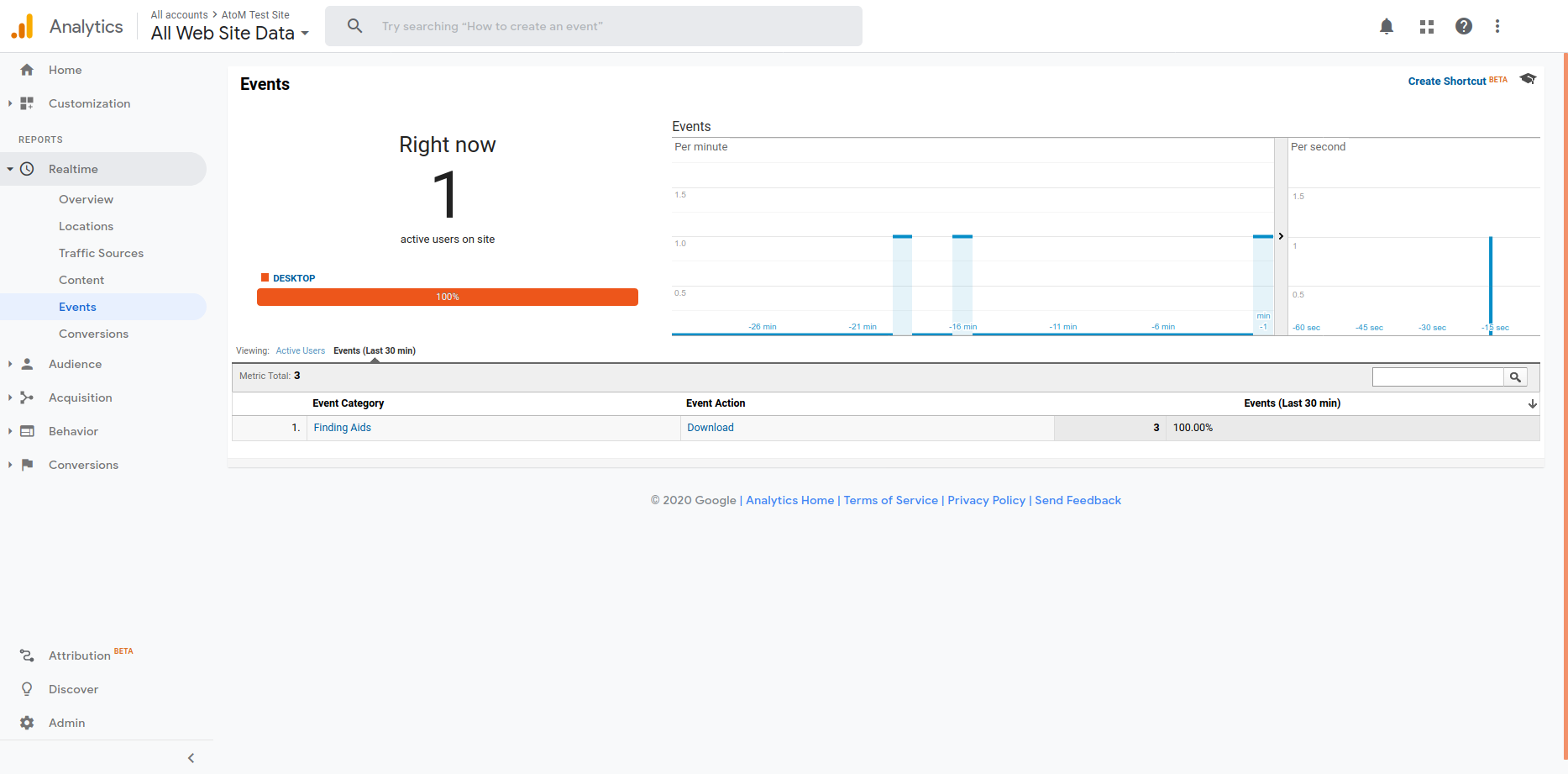 Now you can visit your web property in Google Analytics. You can either check the Realtime > Events report: