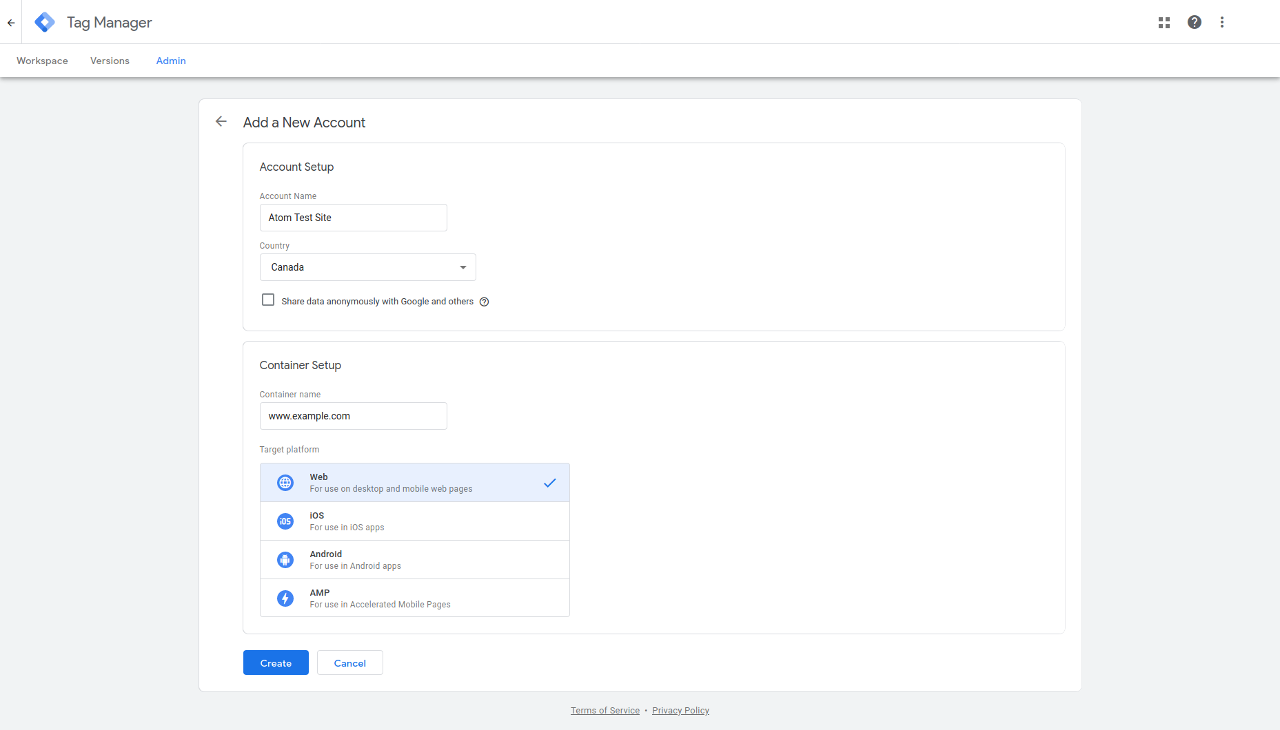 The account will be created with a single Google Tag Manager container and you specify its name and type in the Container Setup area. You can specify it as a Web container for the AtoM functionality.