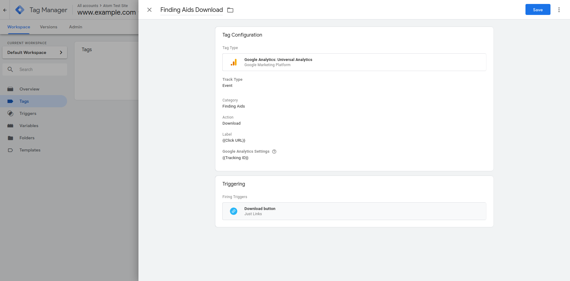 - Finally, name your tag “Finding Aids Download” and click the Save button at the top of the screen.