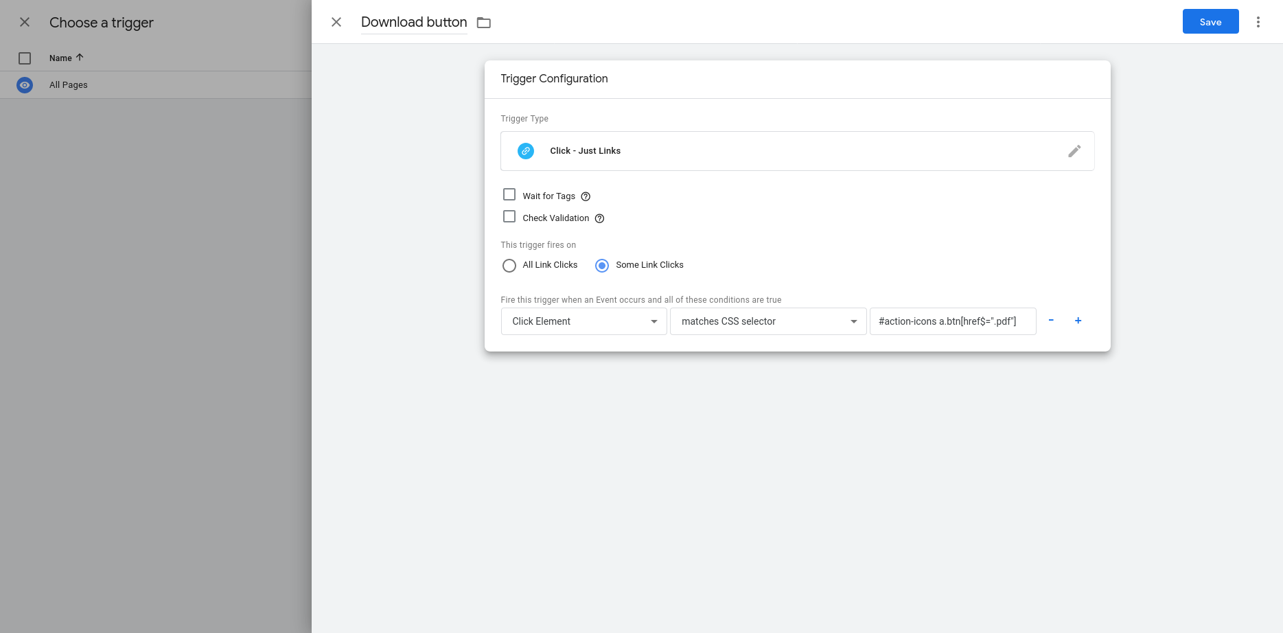 #action-items a.btn(all links that look like a button on the right sidebar) might be good enough or#action-items a.btn[href$=".pdf"](all links that look like a button on the right sidebar and where thehrefURI ends in.pdf) might be way more specific. Name the trigger “Download button” and then click the Save button at the top of the screen.