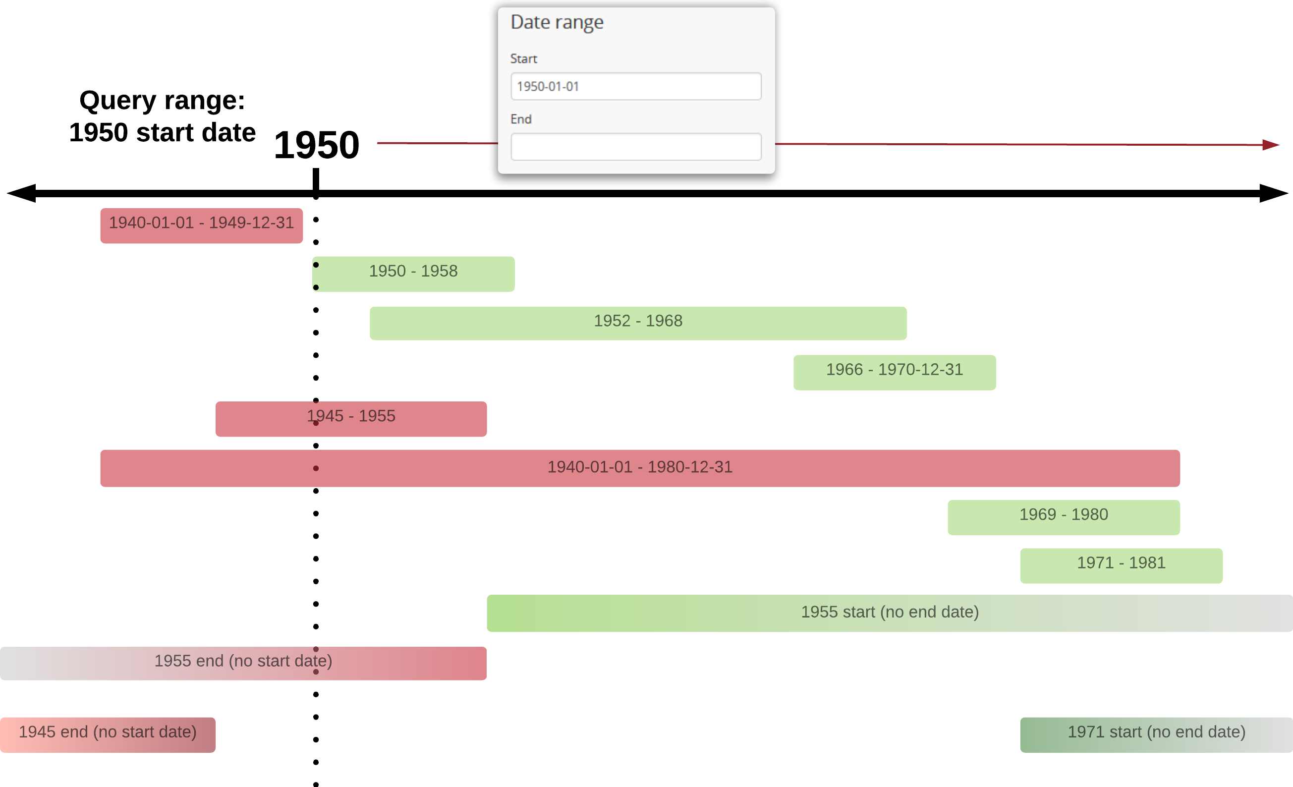 To better clarify these options, some example diagrams have been included below to indicate the difference, illustrating how each option behaves for closed ranges (both start and end date included), and open ranges (where either a start or end date is included, and the second date is left blank). In the following images, results in green will be returned by the search query; results in red will be excluded from the results: