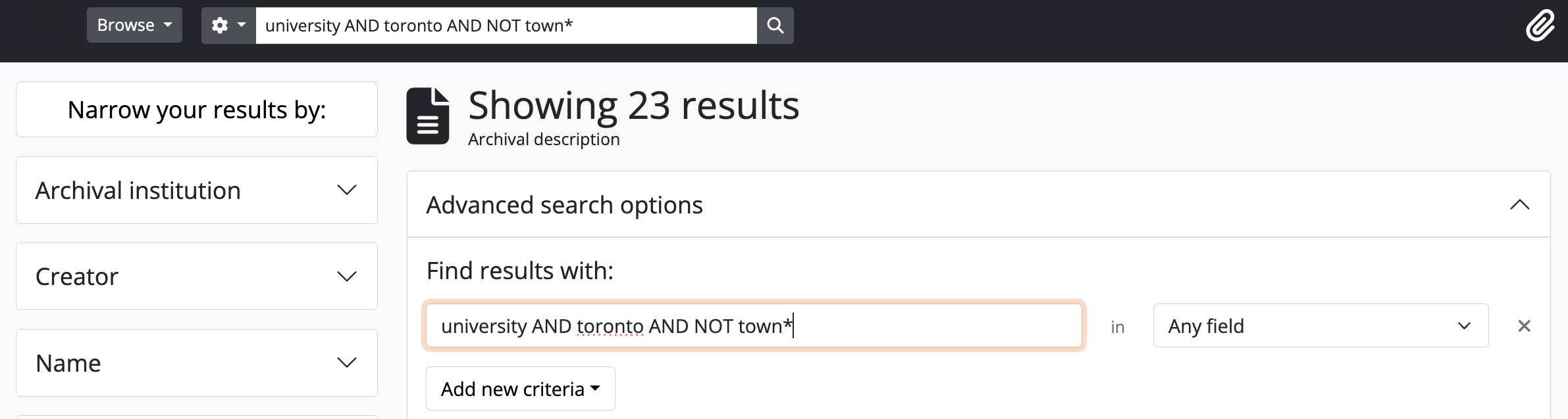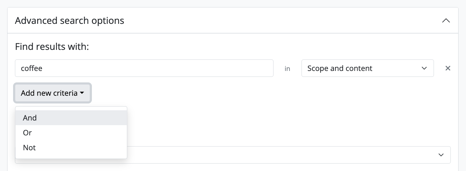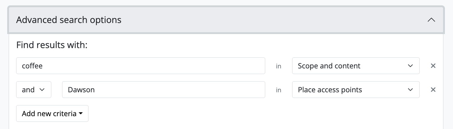 - Use the “Add new criteria” button to build multi-part queries with Boolean search operators via the user interface - by using these operators, you can narrow your search, combine terms, or exclude terms. AtoM will add a new set of fields below, into which you can enter your terms - repeat steps 3-5 as necessary. You can use the X to the right of the fields to remove a row of fields from your Boolean query if needed.