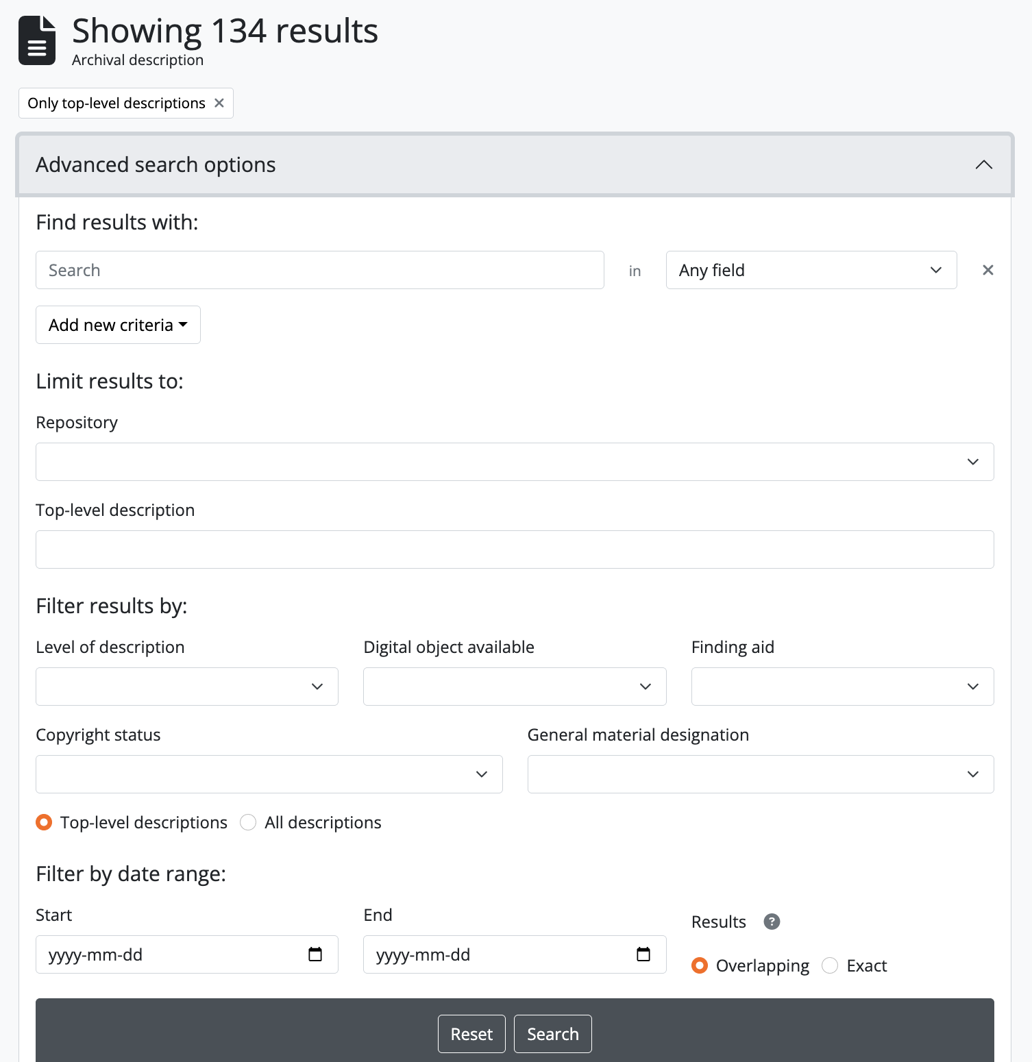 - If you wish to restart your search and quickly clear all filters and boolean fields, you can use the “Reset” button located at the bottom of the Advanced search panel. AtoM will reload the page, with all filters and parameters removed.