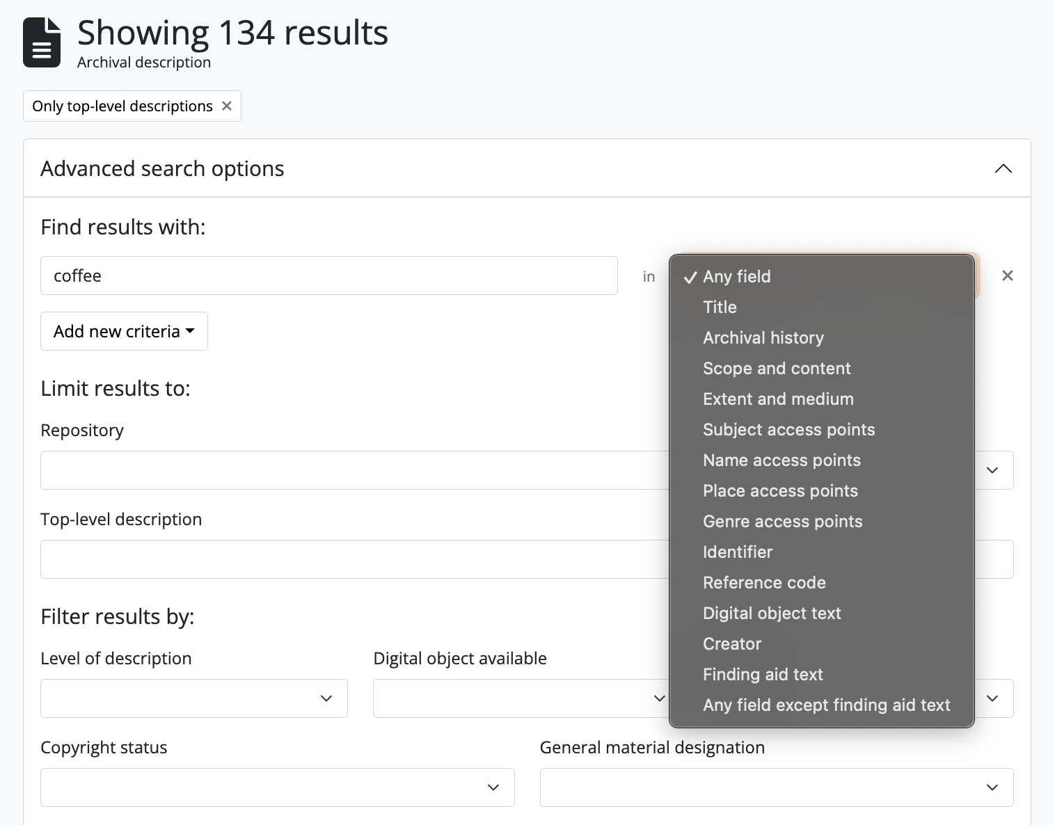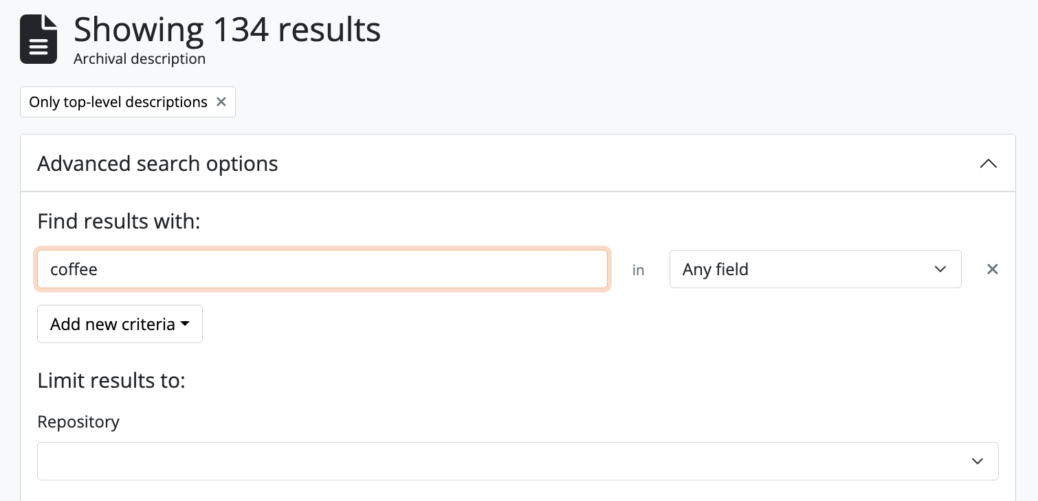 The advanced search options described here apply only to searches for archival descriptions - the advanced search interface returns archival description results by default. To search for other entity or record types, see the sections on Typeahead and faceted search box results and on the Dedicated search boxes available in the Search section.