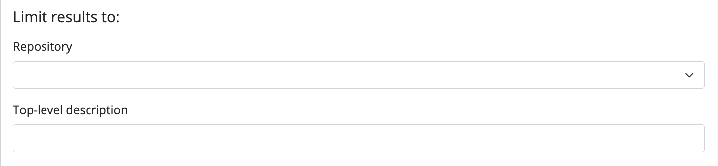 - Repository: Limit the search to the holdings of a specific archival institution. The drop-down menu will be populated by all of the archival institution records in AtoM. Select the repository or archival institution you wish from the drop-down; when you submit your query, results returned will only include those associated with the selected repository.