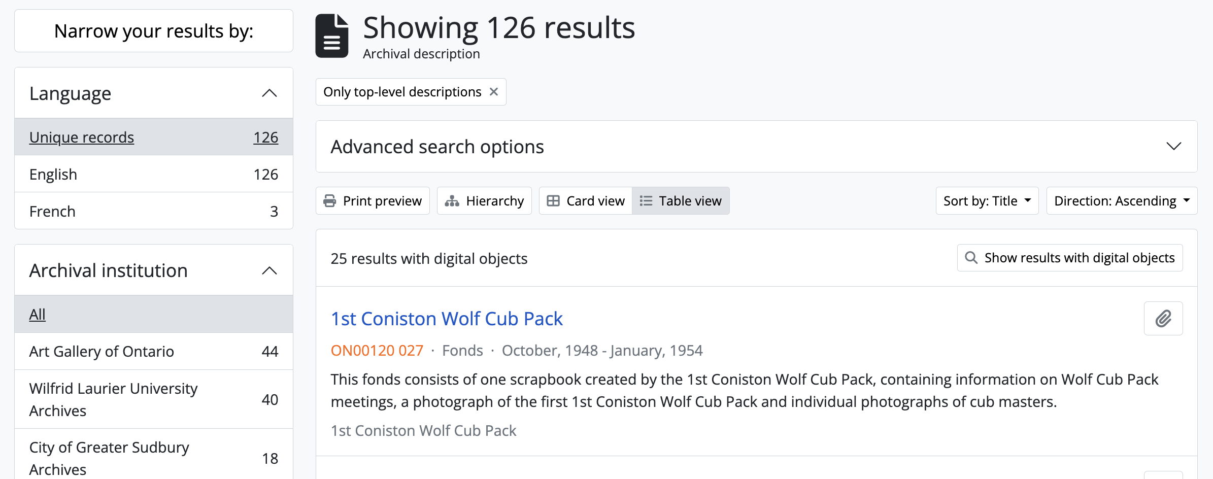 - Advanced search using the AtoM Search box