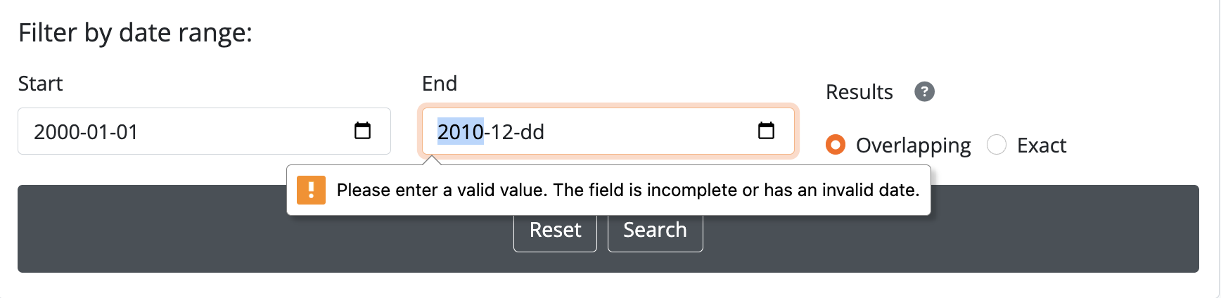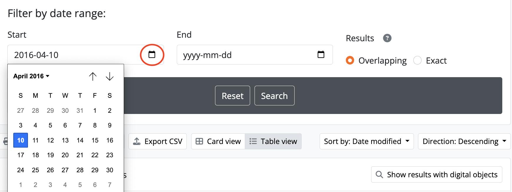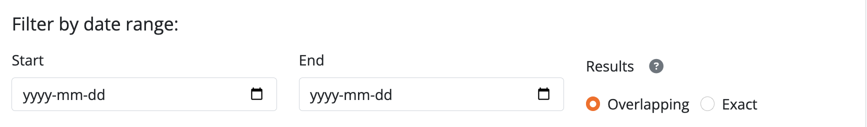 There are 2 ways of searching dates, represented by the radio button options in the Date range search interface - “Overlapping” (which is the default), and “Exact.”