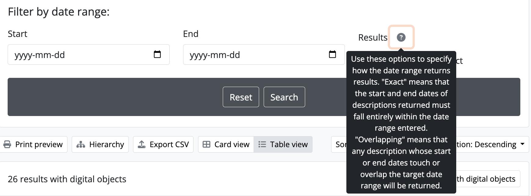 - Finally, the last section, labelled “Filter by date range:”, will allow you to search against the internal StartDate and EndDate values of of creation events associated with an archival description. For more information on using the date range search in AtoM, see below, Date range search filter.