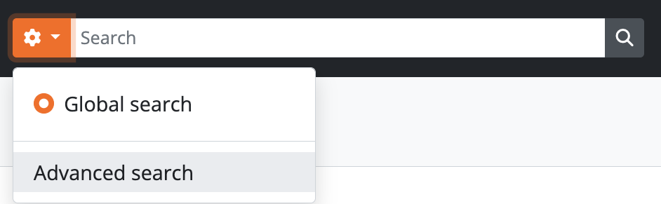 Place your cursor in the search box located in the AtoM header bar. A drop-down menu will appear below the search box - to access the advanced search interface, click on the “Advanced search” link in the drop-down menu.