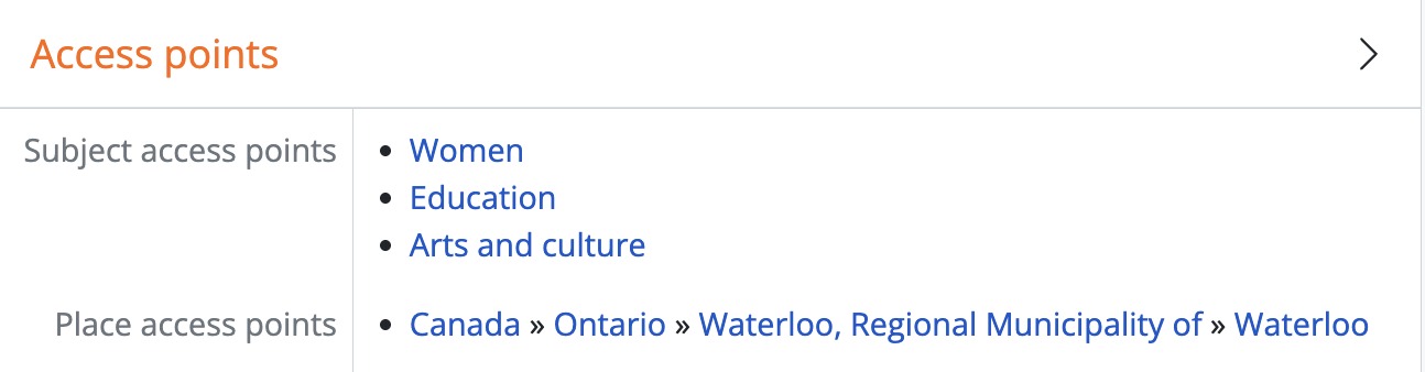 When terms are organized hierarchically in a taxonomy (e.g. nested within broader terms, with a parent to child relationship), and a child term is added as an access point to an archival description, AtoM includes the parent terms as well for context. This is expressed as a breadcrumb trail on archival descriptions in the Access points information area, as shown in the Places example below: