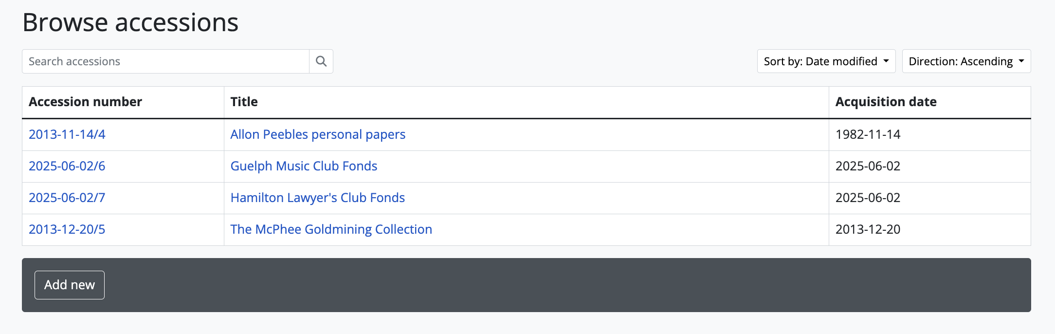 AtoM will display a list of all accessions by accession number as well as when the accession record was updated.