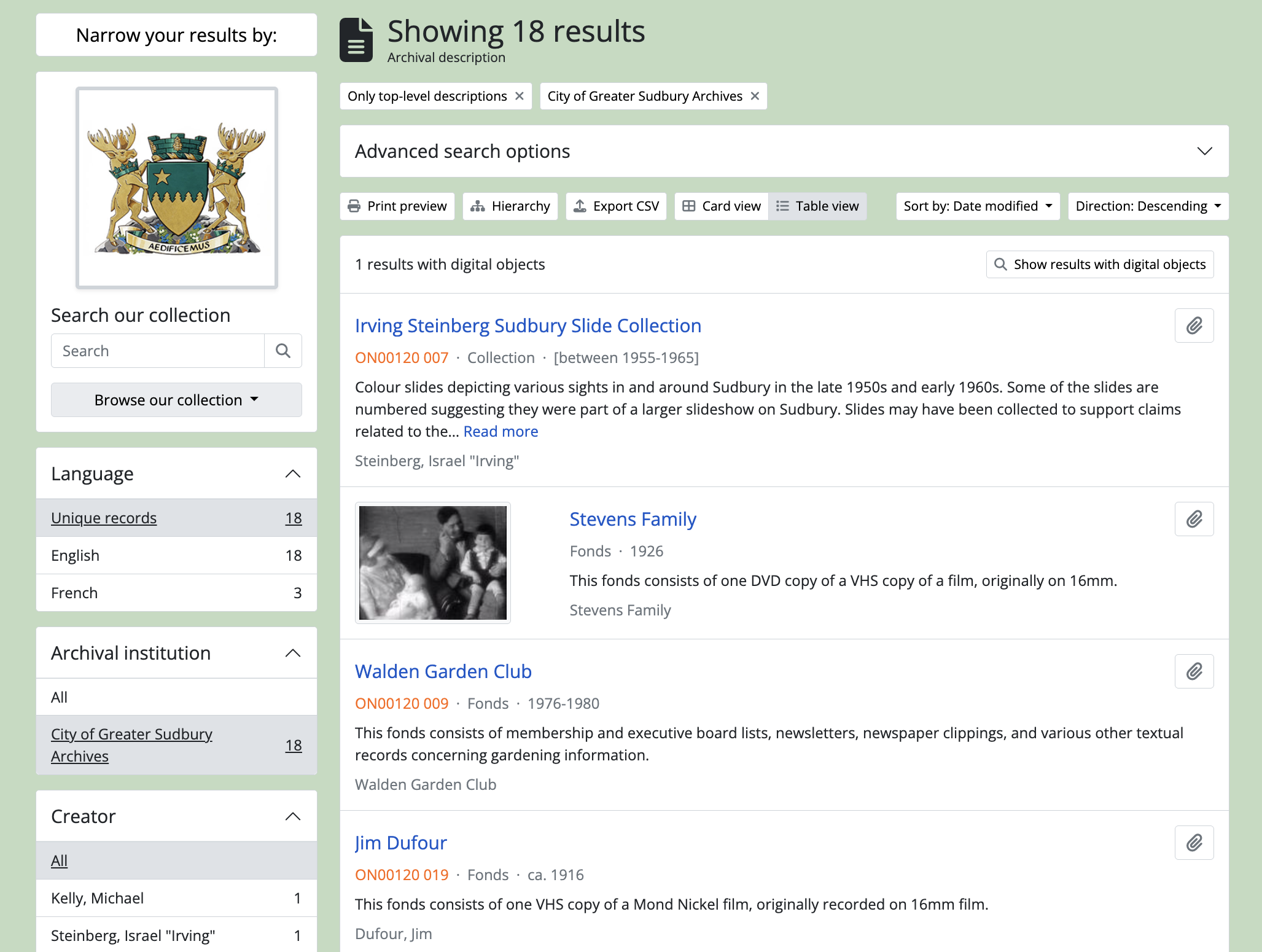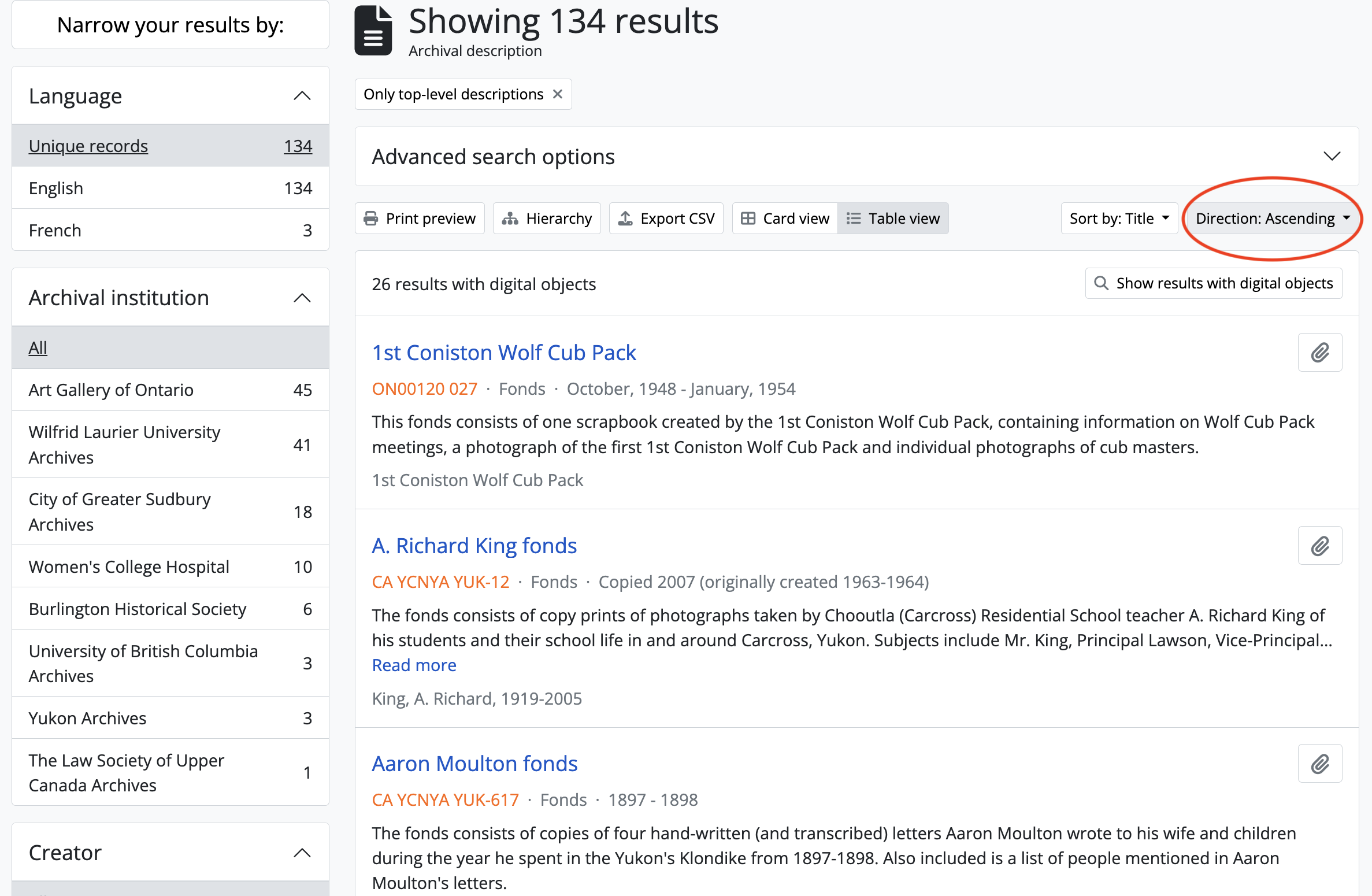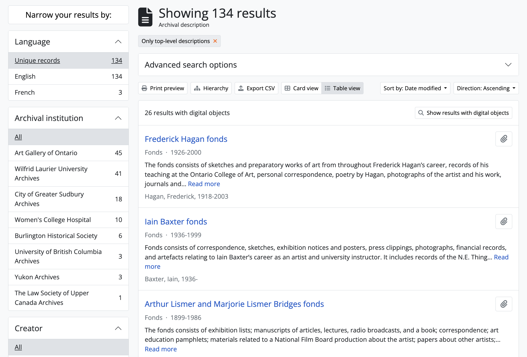 For more information on using the elements of the archival description browse page, see: Browse archival descriptions.