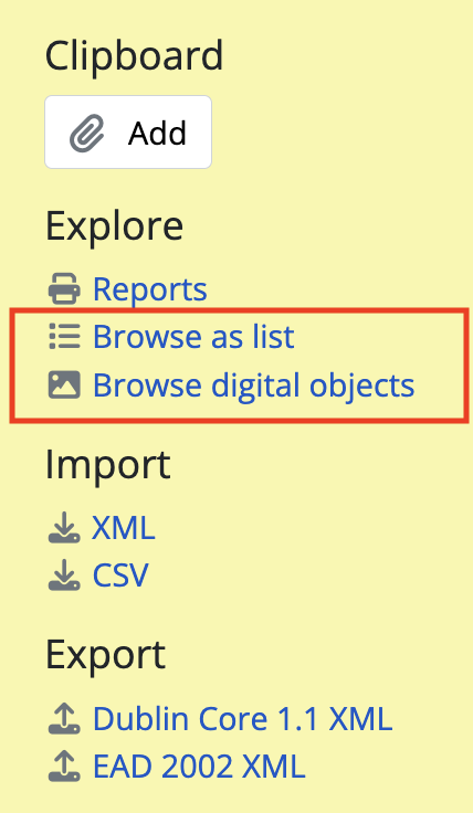There are two options for browsing within an archival unit included here - the “Browse as list” button, and the “Browse digital objects” button. Additionally, if it has been configured by an administrator, there may also be an option to view an inventory. This section will describe the “Browse as list” button - see the Browse digital objects button and Browse inventory list sections below for the other options in this part of the context menu.