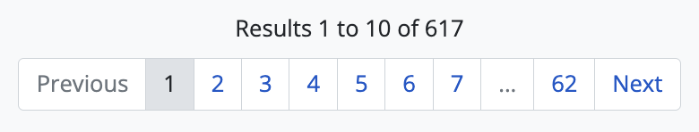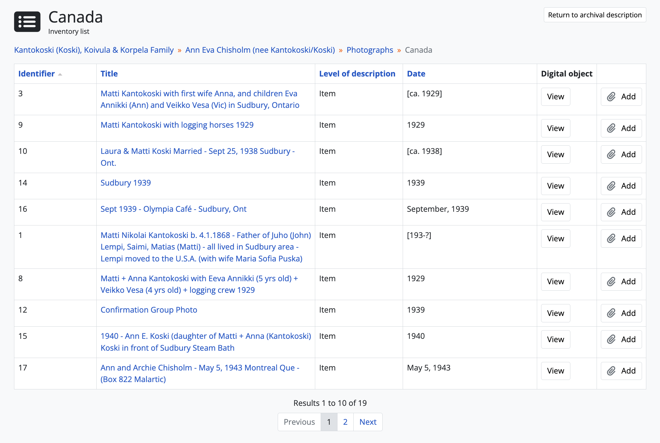 By default, AtoM will display 10 results per page; if there are more than 10 descriptions, a pager will be provided at the bottom of the results.