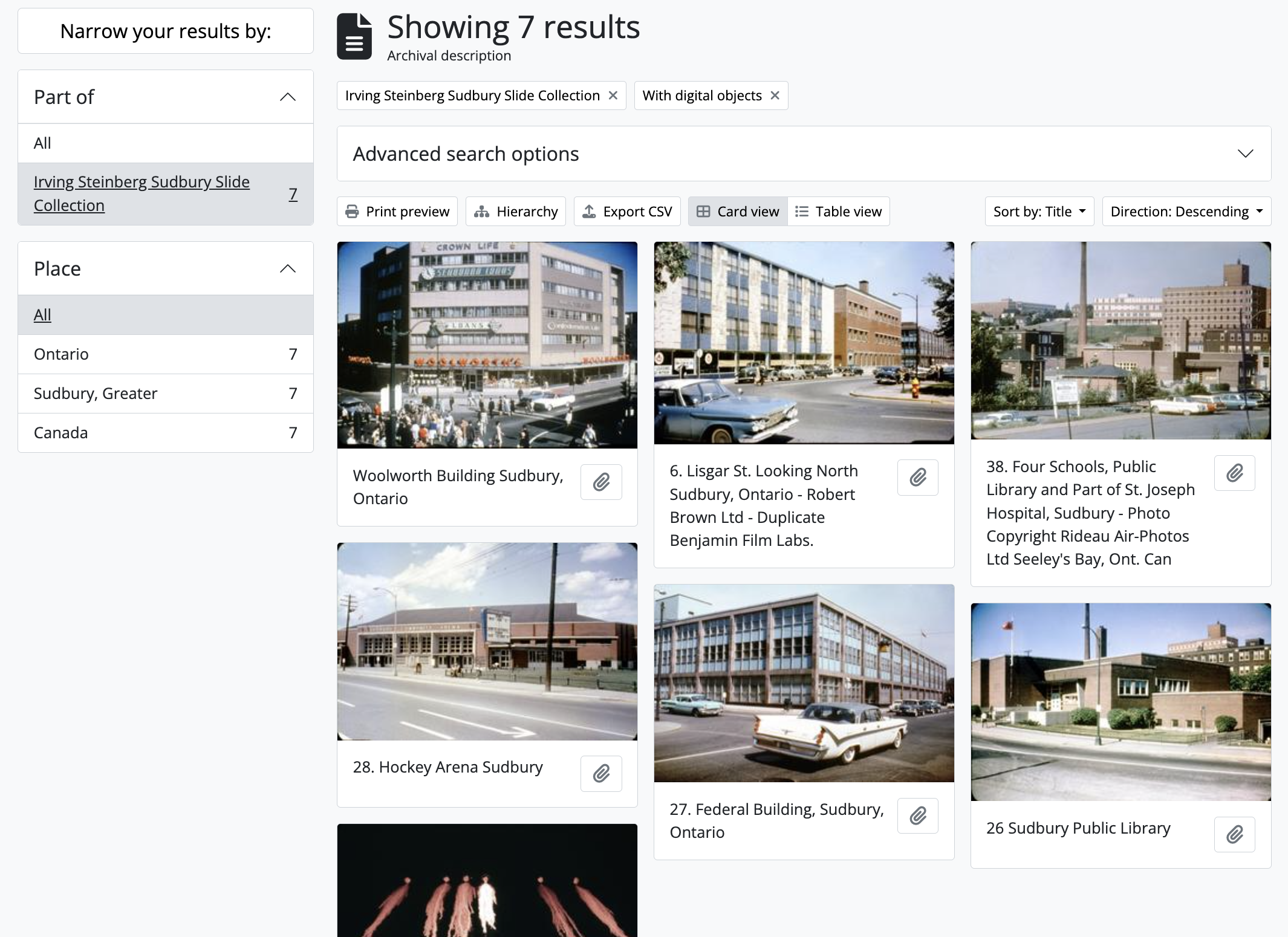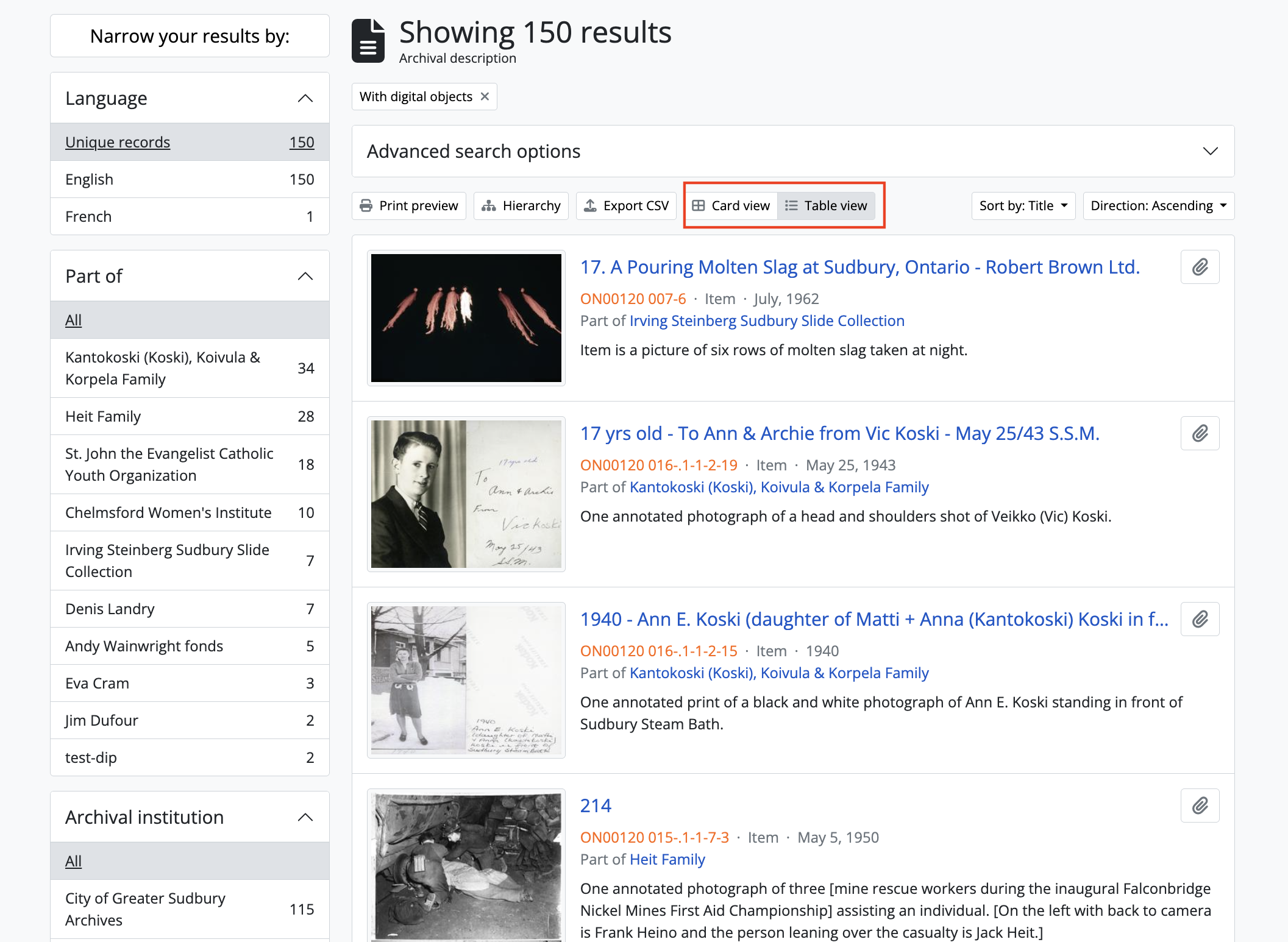 The view of the results can be toggled from the default “card” based view of the Digital object browse page to a “list” view like that found on the archival description browse page: