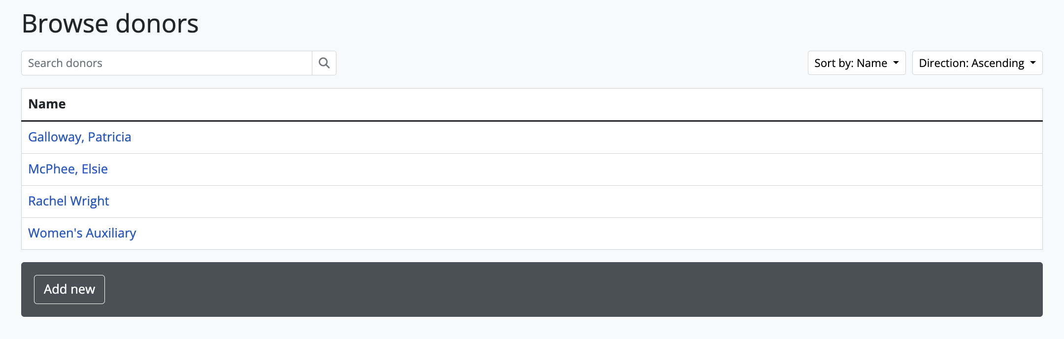 AtoM will display a list of all donors by name as well as when the donor record was updated.
