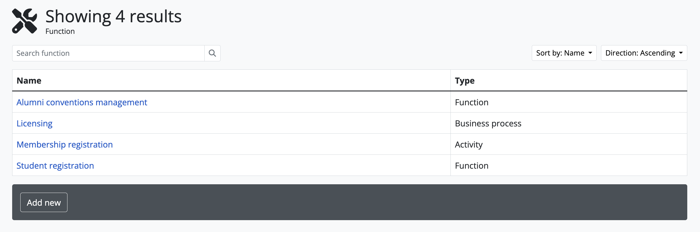 The functions browse page also includes a dedicated search box to help you locate records. For more information on its use, see: Functions.