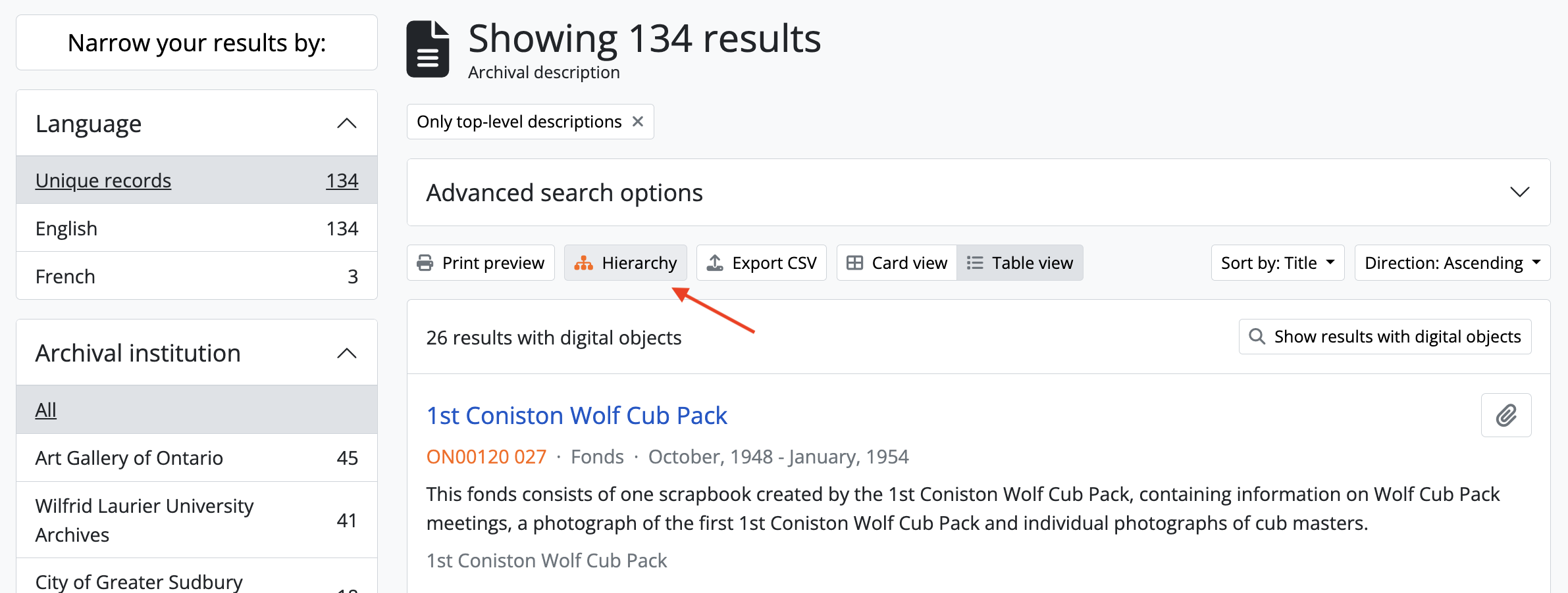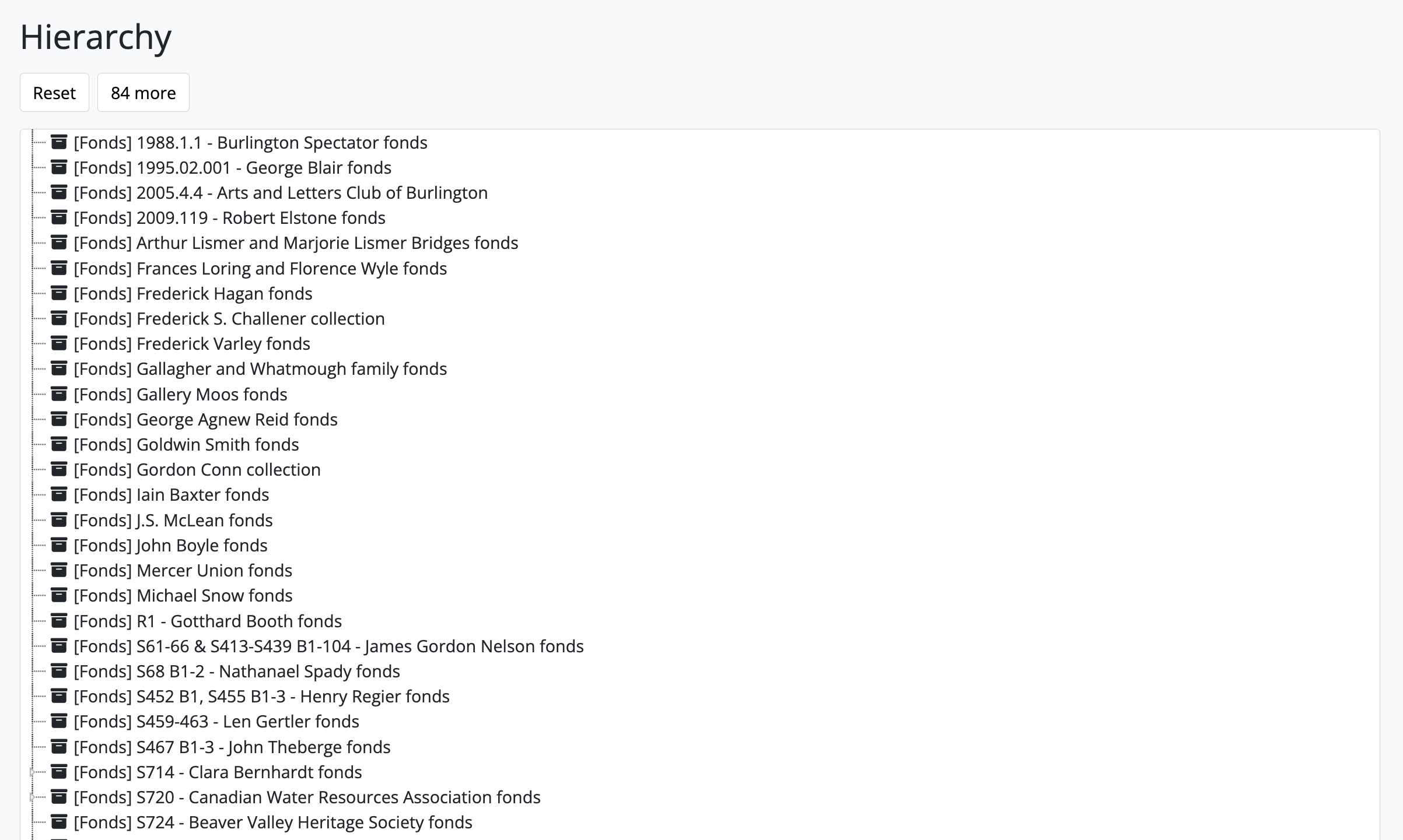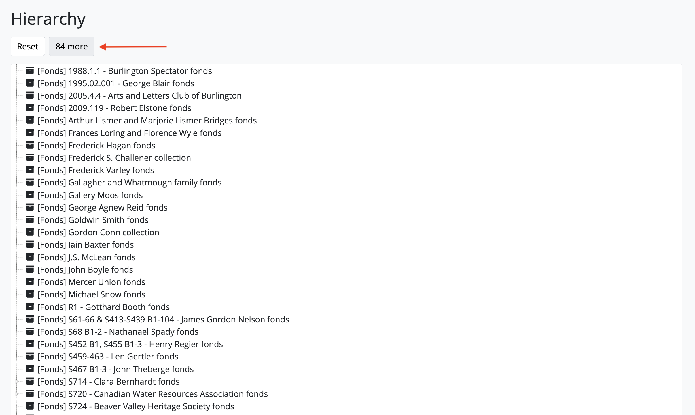 - Click on the name of the archival unit (e.g. fonds or collection) whose lower-level records (children) you would like to explore.