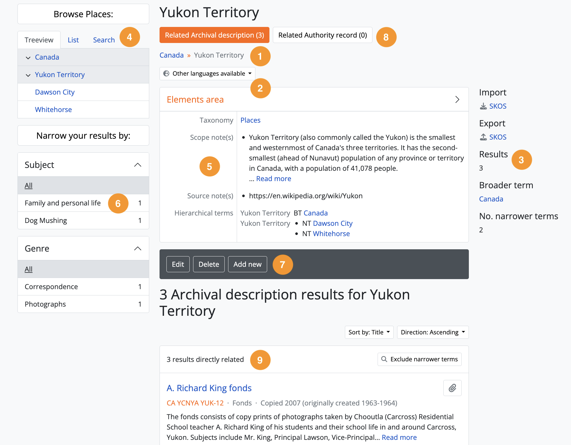 - Additional contextual information is included in the context menu. For more detailed information on the elements of the context menu in this page, see the Subject and Place browse pages entry on the Context menu page. Note that for the Results count, this is entity specific - in the example shown here, it is showing the count of related archival description records, since the results tab (described below in 8) is currently on the description results. A separate count for related authority record results will be shown when the tab is changed.