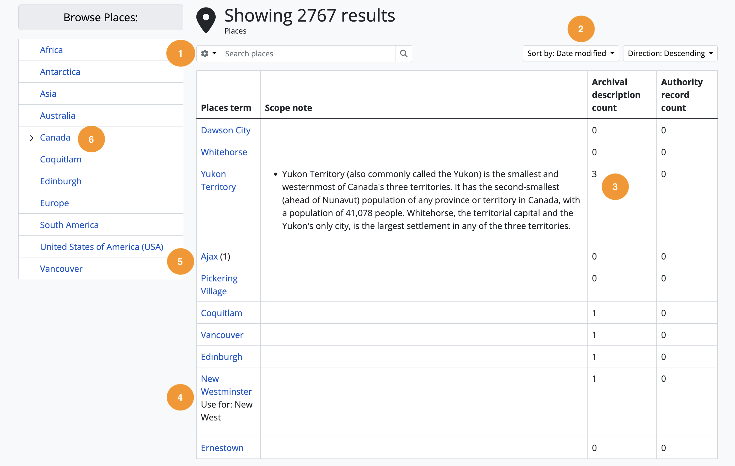 The above image, from the Places browse page, has been annotated with with an orange and white number corresponding to each of the major features of the Places browse page. Each is described below.