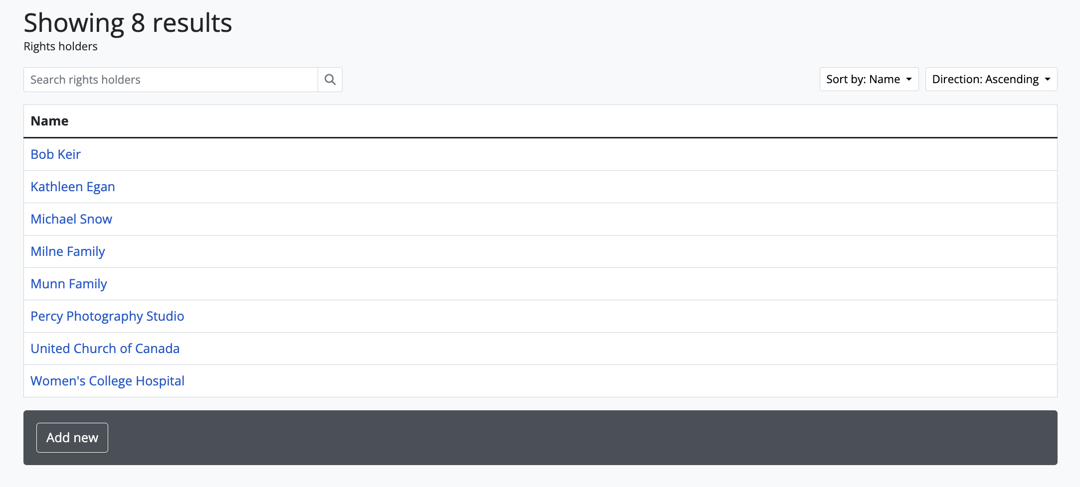 From this screen, users can also search rights holders by name in the search box at the top of the results list. For more information on rights holders record functionality, see Rights. For more information on using the rights holder search box, see: Rights holder search.