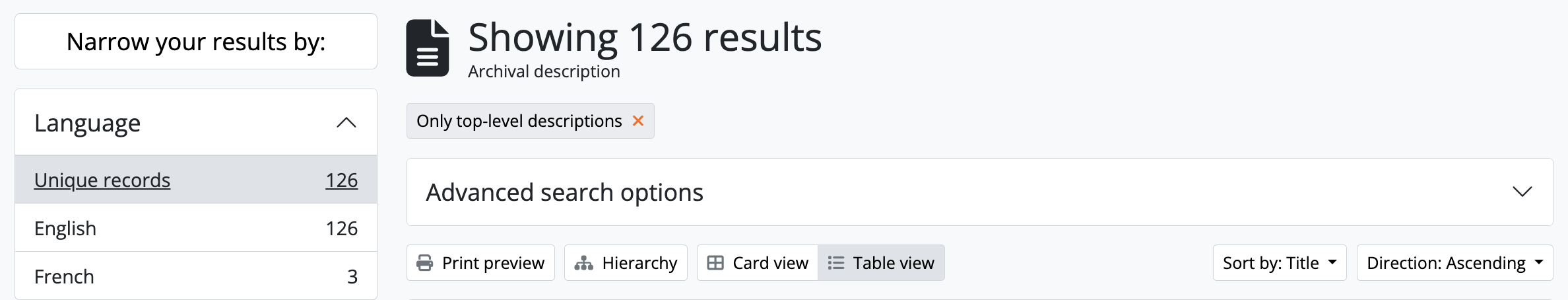 - By default, AtoM will display only top-level parent records when arriving on the Browse page. This limits what you see to the highest levels of description.