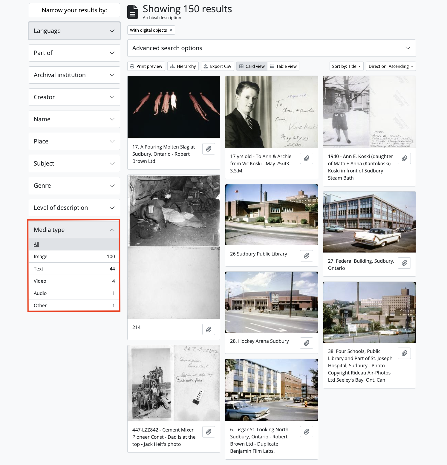 Users can filter the results by media type by clicking open the “Media type” facet in the left-hand facet column and selecting a specific media type - default types in AtoM are audio, image, text, video, and other.