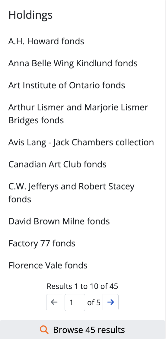 A holdings count appears under the holdings list, which includes the number of results per page, and the total - e.g. Results 1 to 10 of 45, etc.
