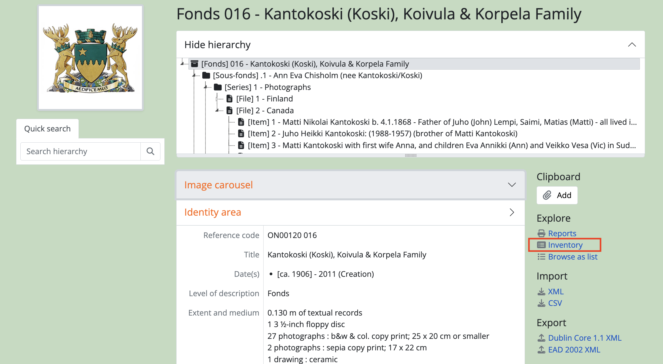 If you are already on the view page of an archival description that includes a descriptive hierarchy (i.e. a top-level description such as a fonds, collection, or series that has lower-level children), you can explore the descriptions contained in the archival unit using the browse buttons included in the “Explore” section of the right-hand context menu. For more information on context menu items in AtoM, see: Context menu and Recurring page elements.