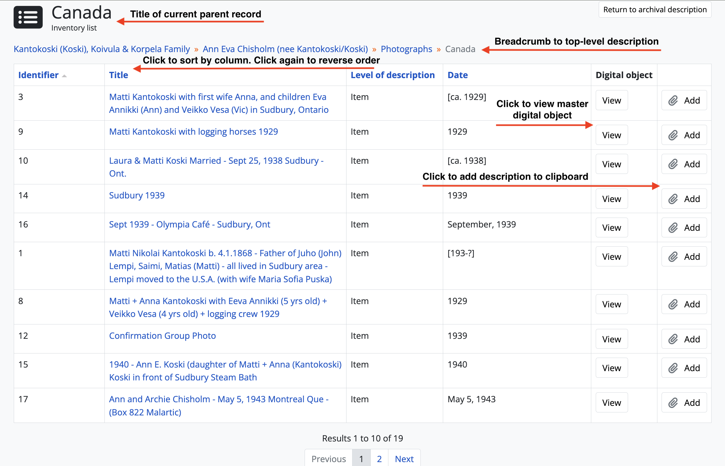 There are several ways to explore lower-level records (i.e. children) within an archival unit (such as a fonds, collection, or series). Each will be described below.