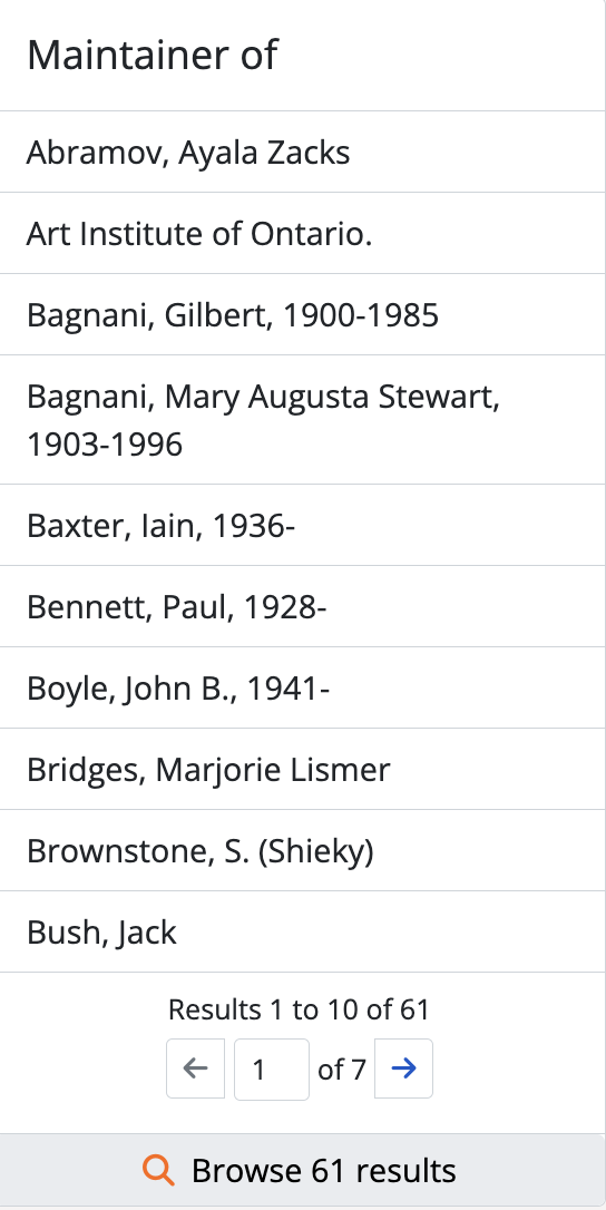 At the bottom of the maintained list is a browse link, that lists the total number of authority records maintained by the repository. Clicking on this link will take a user to an authority record browse page limited to the current repository. See Browse people, families and organizations for more information on browsing.