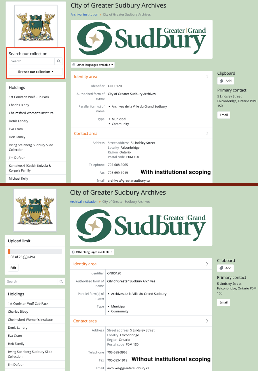 For more information on applying a custom background color, uploading a custom repository logo, and other aspects of archival institution theming, see:
