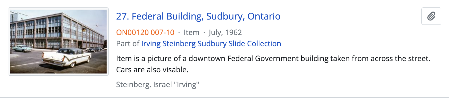 - Part of - if the record is the child of a hierarchical archival unit (e.g. a file in a fonds, etc), the title of the parent record will be displayed as a hyperlink beneath the identifier, level of description, and creation dates.