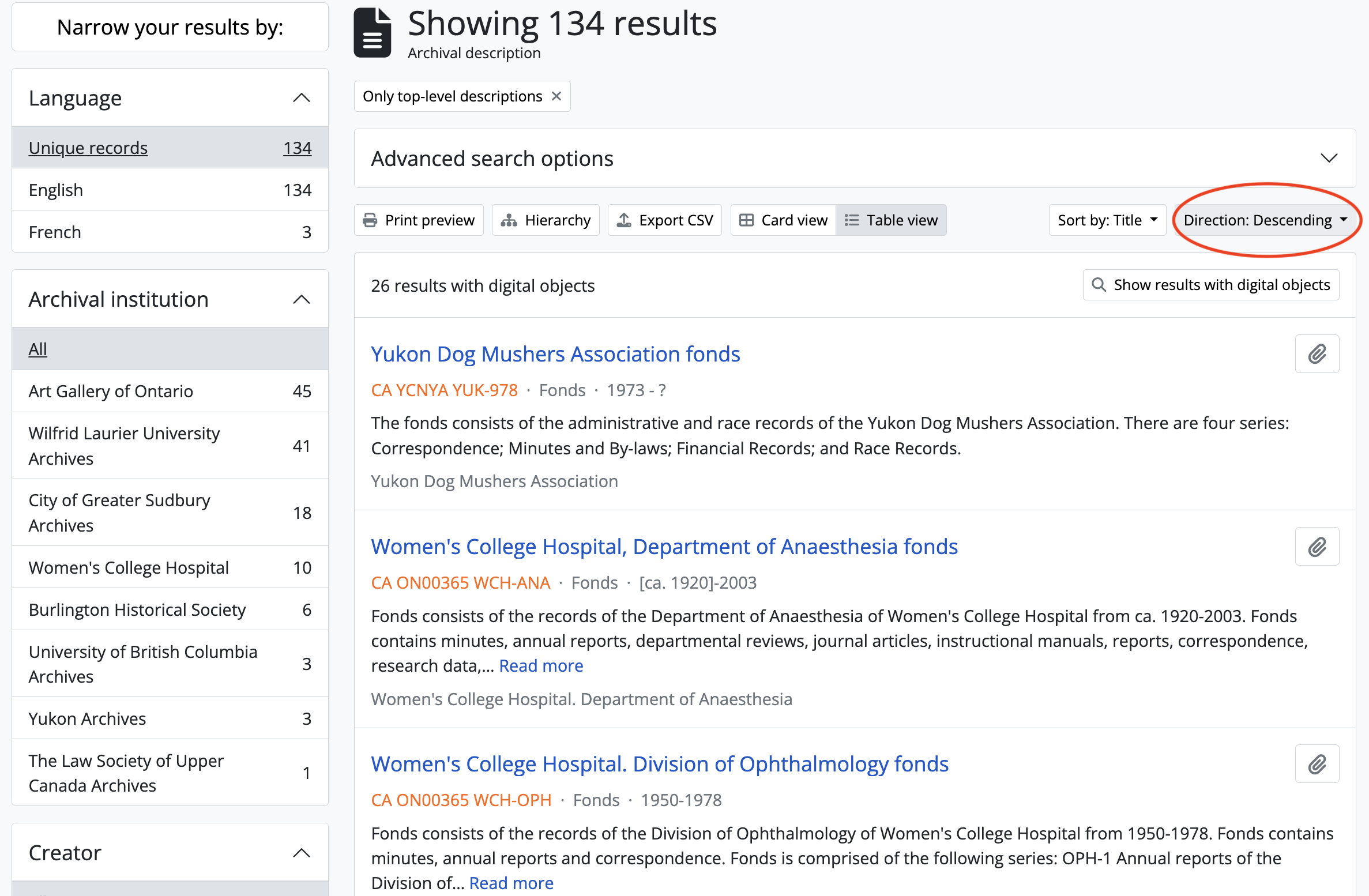 By choosing ‘Direction: Ascending’ the user can view the browse results from the beginning of the list:
