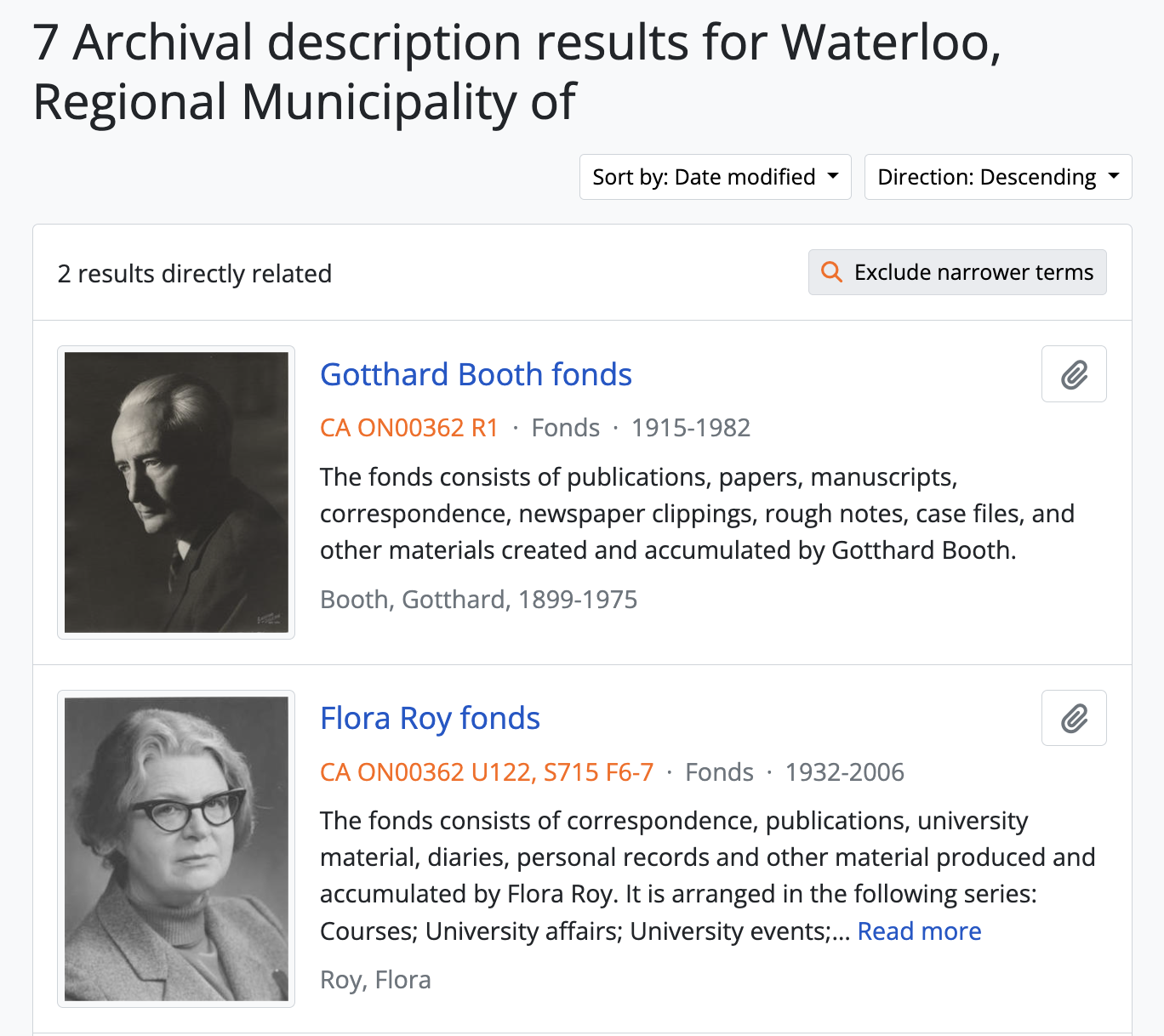 Click the “Exclude narrower terms” button at the top of the results, and AtoM will reload the page, displaying only archival description results where the term has been directly added (and not inherited from a narrower term).
