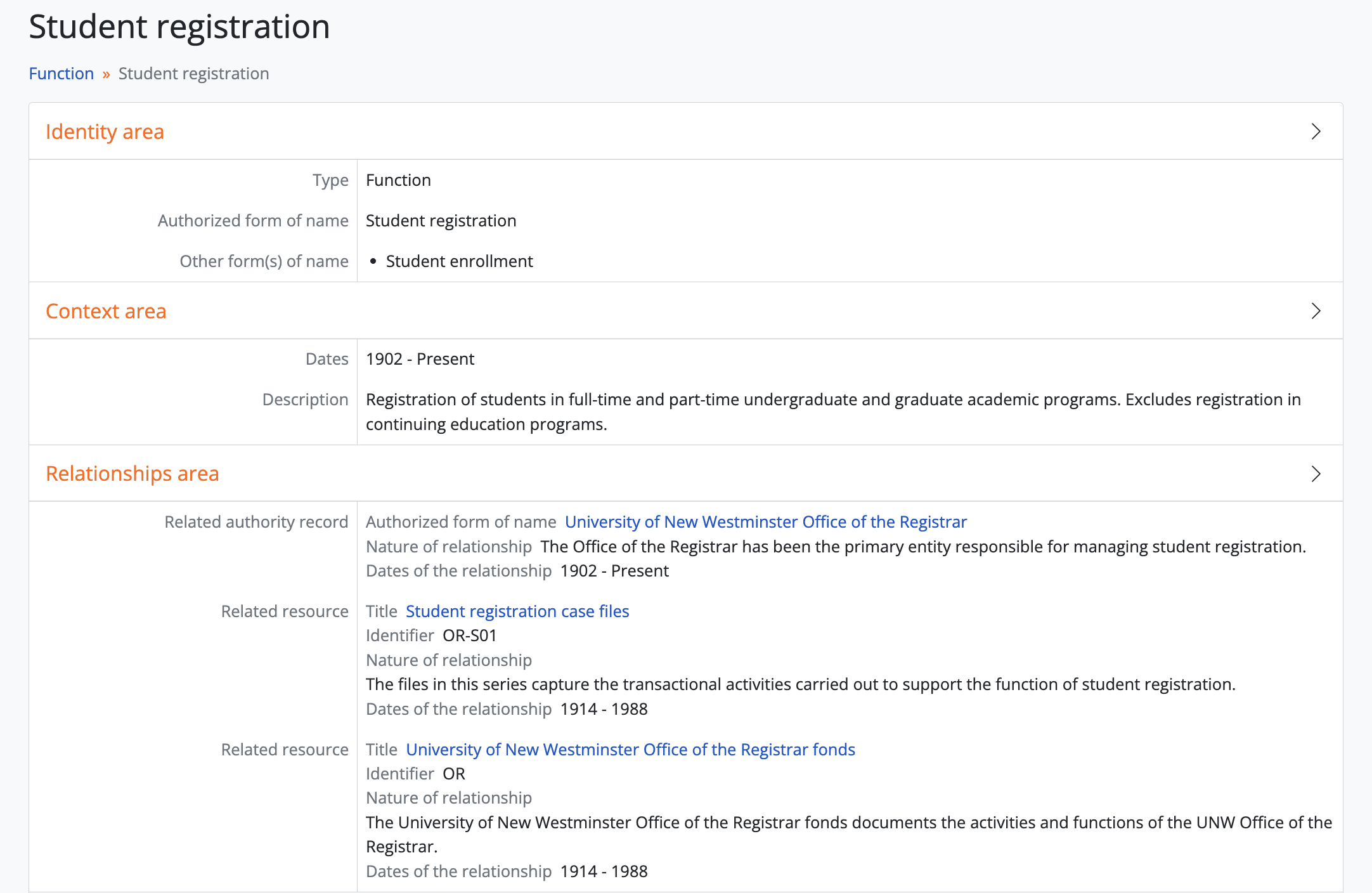 When a user clicks on a function, the record for that function will display, including related functions and related resources.