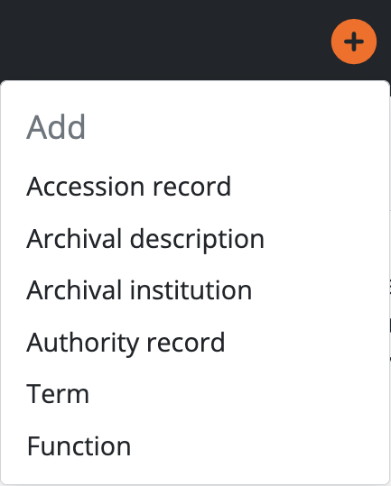 The Add menu’s options will redirect users to blank records in edit mode, ready for data entry. Using the Add menu, users can quickly create new accession records, archival descriptions, archival institutions, authority records, functions, and terms.