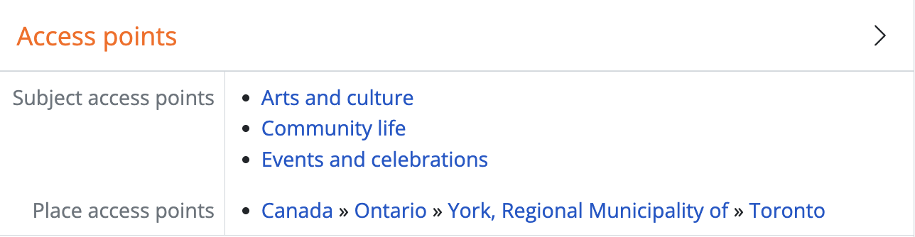 - Additionally, taxonomy terms (such as places and subjects) that are organized hierarchically will also display parent terms as a breadcrumb trail when added to an archival description - for example, if the subject term ‘Apple’ is a child of the term ‘Fruit’, then when ‘Apple’ is added as a subject access point to an archival description, it will be expressed as: Fruit >> Apple. These terms will be displayed in the “Access” information area of the related archival description, as well as in the context menu on the right-hand-side. (See: Terms for more information on working with taxonomy terms such as subjects and places in AtoM)