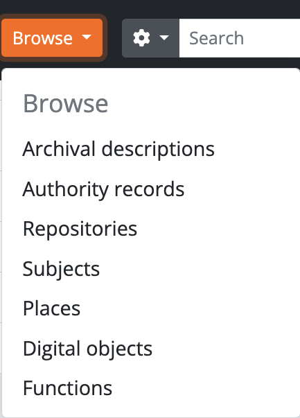 In AtoM’s default theme (the Dominion theme) the browse menu appears in a drop-down next to the search box in the header bar on all pages. The drop-down menu contains links to browse pages for archival descriptions, authority records, archival institutions, subjects, places, and digital objects.